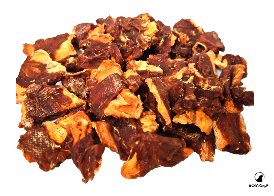 Chipsy z Marchewki i Kaczki to delikatna w smaku przekąska dla Twojego psiaka. W każdym kawałku znajdziemy połączenie kaczki z marchewką. Zaspokajają potrzebę żucia. Zawiera 52% marchewki i 39% kaczki. Wielkość kawałków dł. 3cm szerokość ok. 2cm. grubość 0,5cm. Przekąska stanowi dodatkowe uzupełnienie codziennej diety, a żując piesek wzmacnia dziąsła oraz czyści zęby.